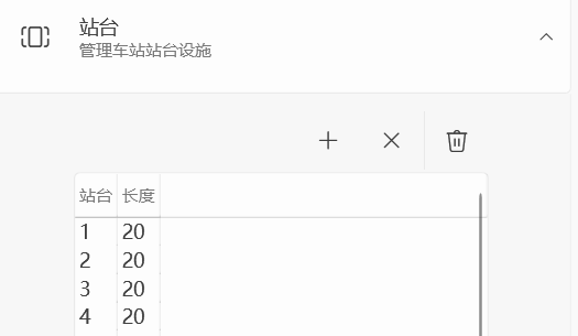 站台面板提供站台管理功能,你可以通过操作栏来新增、删除、清空站台。站台长度以节为单位。