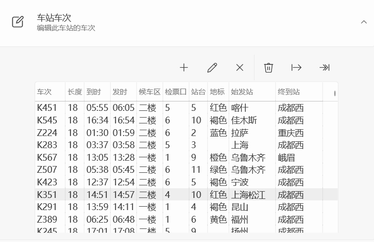 在页面左侧是车站操作栏和车站列表。车站操作栏从左至右提供四项功能: